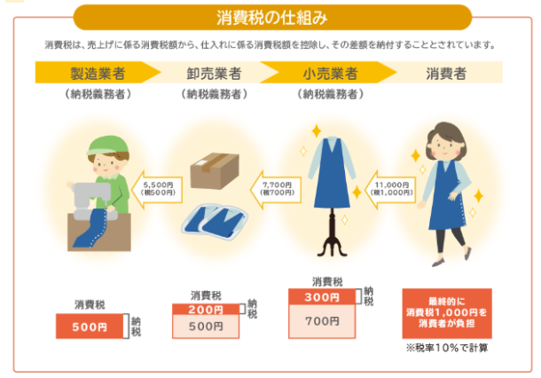 事業者に課される消費税相当額は主にコストとして販売価格に含まれており、最終的には消費者が負担する形になっています。