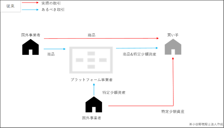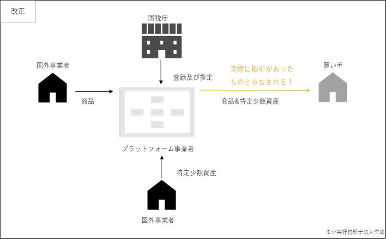 令和10年4月より、デジタルプラットフォームを介して行う次に掲げる資産の譲渡のうち、指定を受けたプラットフォーム事業者(「第2種プラットフォーム事業者」(仮称))を介してその対価を収受するものについては、第2種プラットフォーム事業者が行ったものとみなされます。